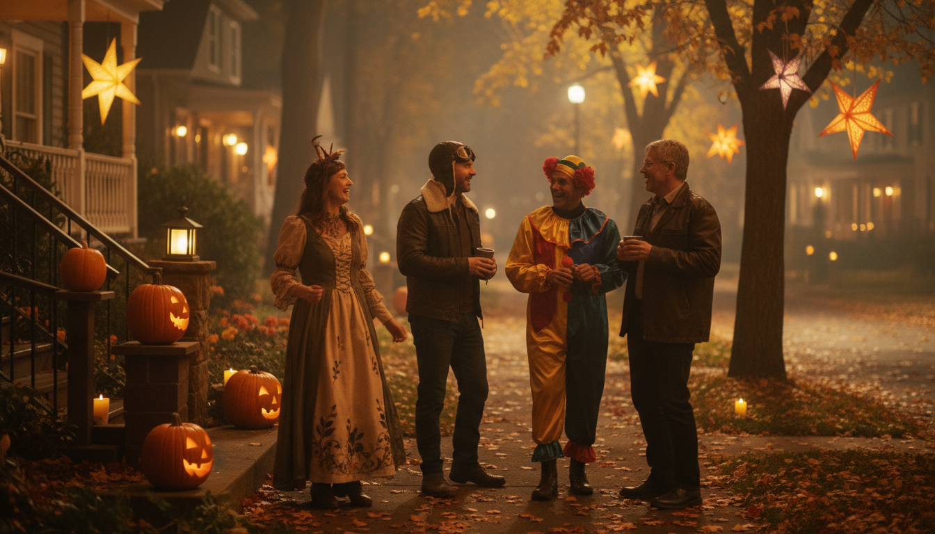 Rue résidentielle éclairée par des lanternes et des citrouilles ; des personnes costumées discutent et rient dans une ambiance chaleureuse et conviviale.